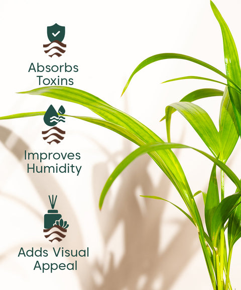Areca Palm features soft, feathery fronds that bring a breezy tropical charm to indoor spaces. It thrives in bright spots and is safe for pets, making it ideal for modern homes and workspaces. Paired with a metal self-watering pot, it offers style with low-effort care.
