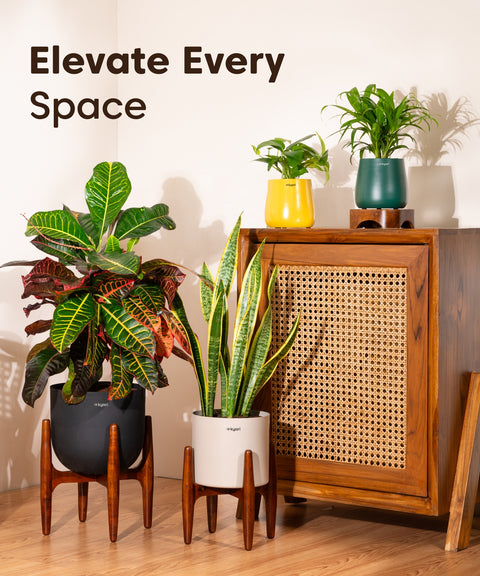 Pair the large pot with a wooden stand for added height and a cohesive look with wooden furniture.